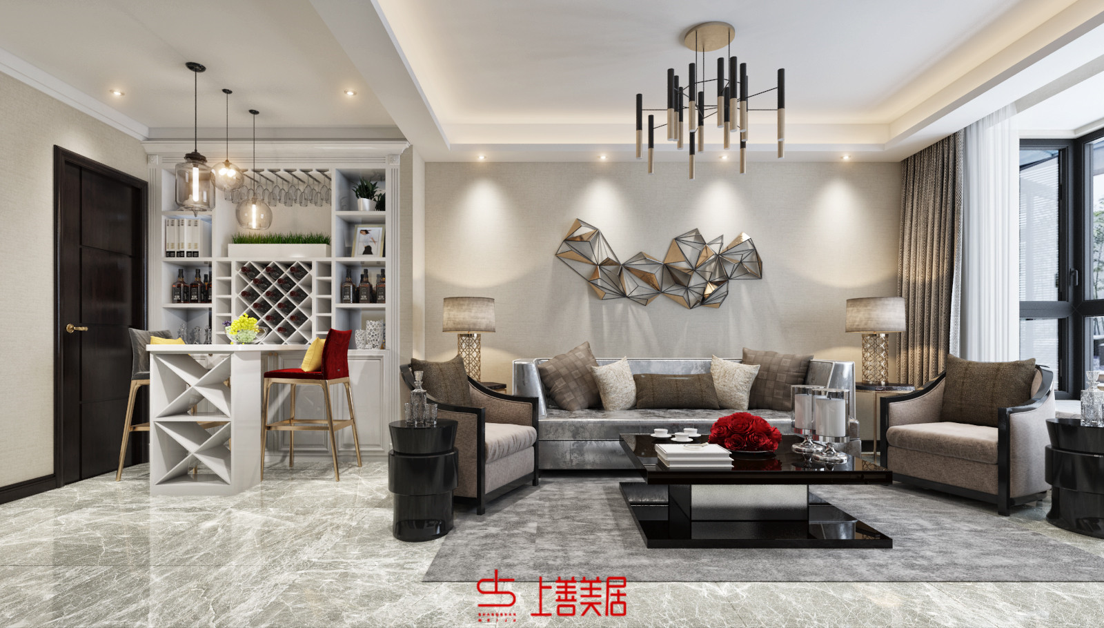 營造一種低調(diào)奢華的現(xiàn)代簡約氛圍,一種既厚重華麗又具時尚特色的視覺效果。整個空間用硬朗的金屬和玻璃與柔性的墻紙搭配,及黑白兩色的大理石...